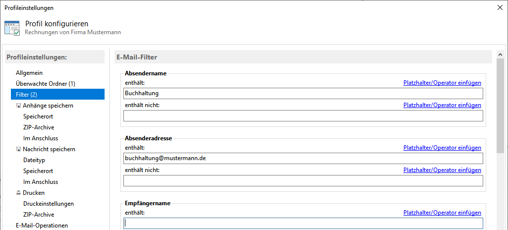 "D:\Rechnungen\2019\Mustermann GmbH". Auch in den Dateinamen des Anhangs können verschiedene E-Mail-Eigenschaften integriert