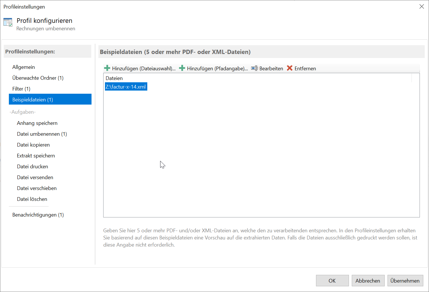 Geben Sie hier 5 oder mehr PDF- und/oder XML-Dateien an, welche den zu verarbeitenden Dateien entsprechen. In den Profileinstellungen erhalten Sie basierend
