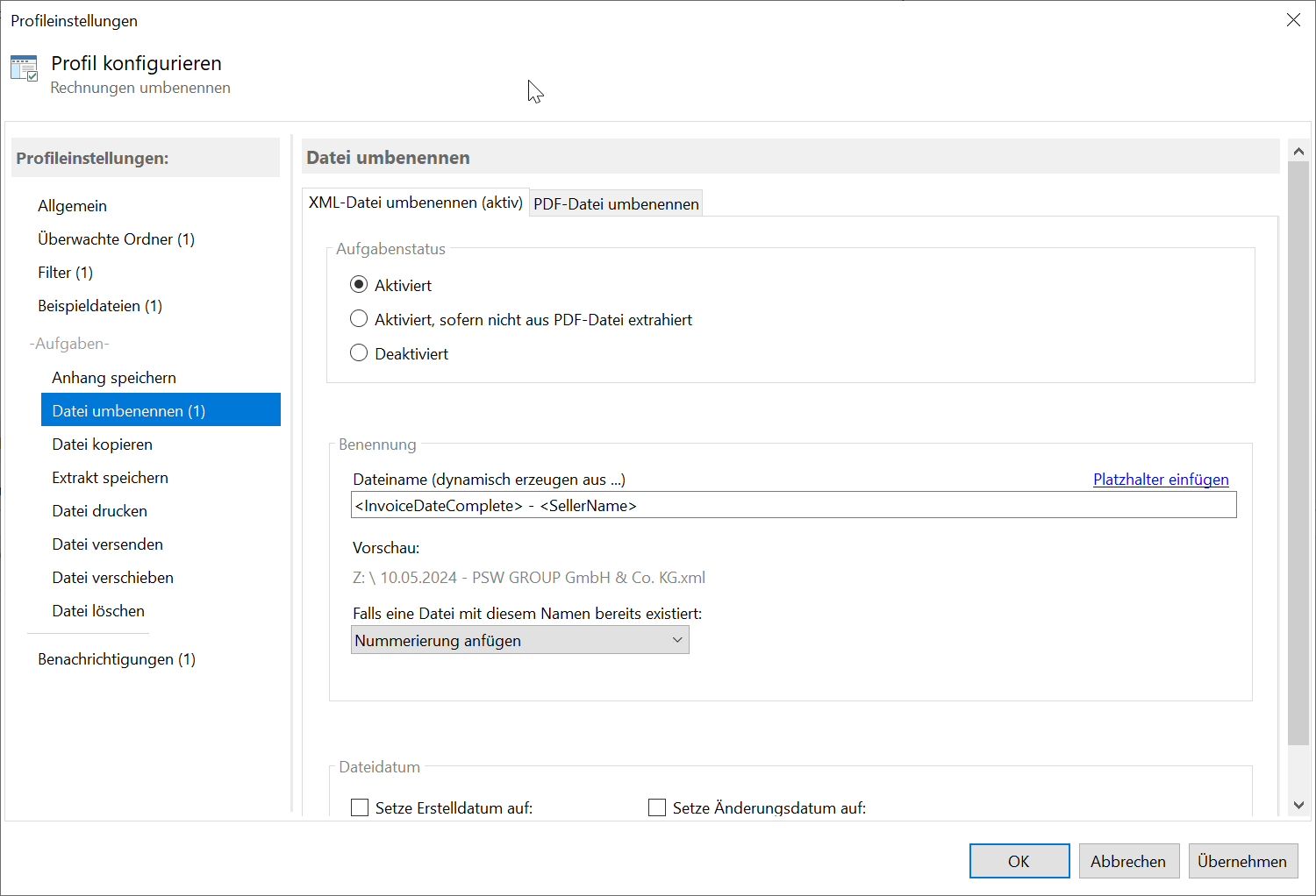 Optional können Sie auch das Erstell- oder Änderungsdatum der verarbeiteten Datei anpassen, beispielsweise auf das Rechnungsdatum setzen.